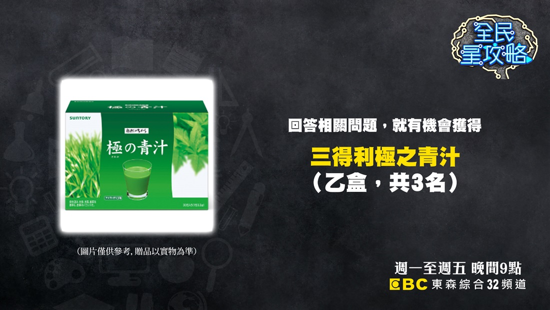 回答本節目出題,即有機會獲得三得利「極之青汁」(乙盒,共3名)
